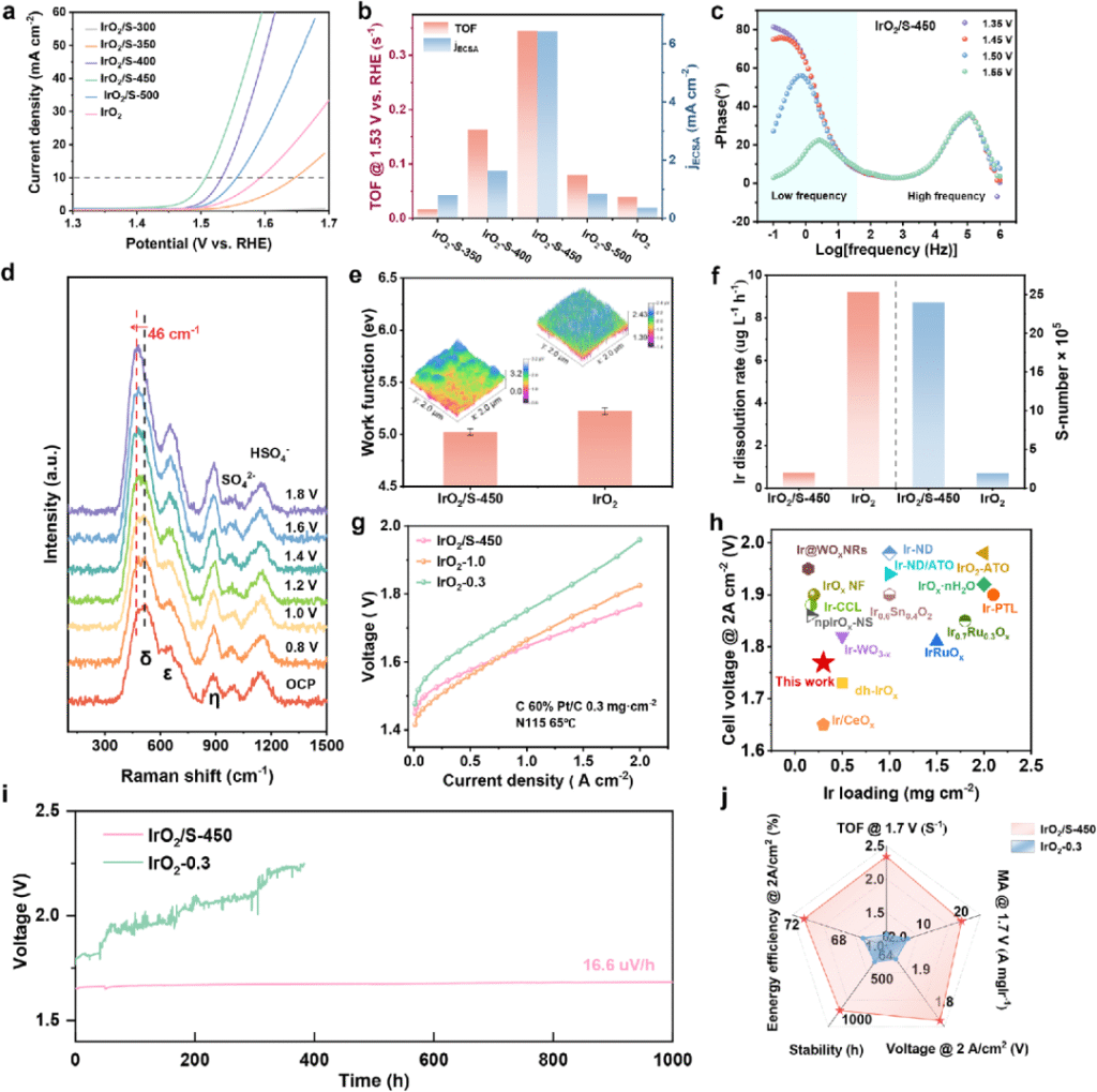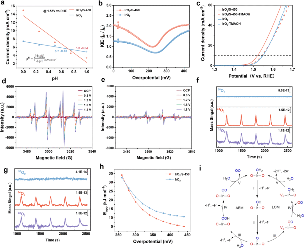 近日,中科院上海高等研究院楊輝研究員團(tuán)隊(duì)與寧波中科科創(chuàng)在質(zhì)子交換膜水電解槽(PEMWE)陽極銥基催化劑研發(fā)領(lǐng)域取得重要進(jìn)展。傳統(tǒng)IrO?催化劑遵循吸附演化機(jī)制(AEM),受限于線性關(guān)系制約,本征活性難以突破。晶格氧機(jī)制(LOM) 通過直接利用晶格氧參與反應(yīng),可打破能壘限制,但會引發(fā)晶格氧流失導(dǎo)致Ir-O鍵弱化。團(tuán)隊(duì)提出一種硫介導(dǎo)的IrO2催化劑(IrO2/S),使OER途徑從傳統(tǒng)的AEM切換到LOM機(jī)制,同時(shí)IrO2/S中的晶格畸變和不飽和Ir-O配位產(chǎn)生了氧非鍵態(tài),在LOM主導(dǎo)的OER過程中充當(dāng)電子犧牲劑來保存Ir-O鍵。IrO2/S在低Ir用量(0.3 mg cm-2)下展示出優(yōu)異的催化活性(1.769 V, 2.0 A cm-2)與穩(wěn)定性(16.6μV h-1@1.0 A cm – 2)。相關(guān)成果以“Sulfur-Doped IrO2 Enable Pathway Switch to Lattice Oxygen Mechanism with Enhanced Stability for Low Iridium PEM Water Electrolysis”為題,于6月23日發(fā)表在Advanced Materials上。